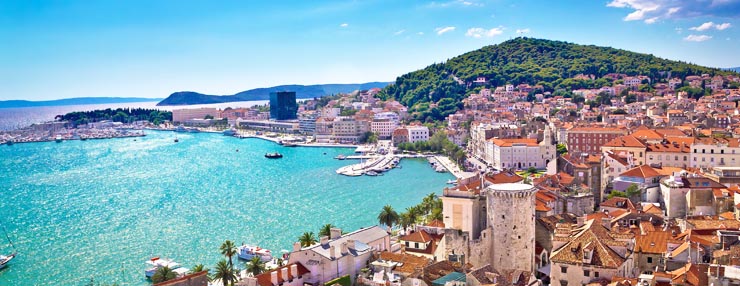 Split waterfront and Marjan hill aerial view, Dalmatia, Croatia